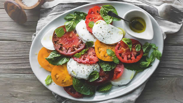 Pomodoro, mozzarella di bufala, spinaci, radicchio trevisano